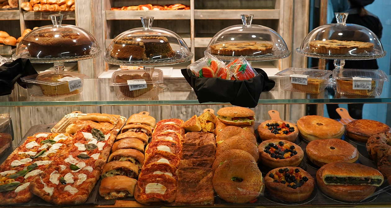 Alla Bakery Grangusto, gesti antichi e passione contemporanea guidano impasti che rispettano il tempo: attesa, lievitazione e cottura lenta. Farine selezionate, lievito madre e lavorazione a mano; cottura su pietra in forni a legna per fragranza e leggerezza. Pane dalle croste dorate, dal bianco all’Altamura e varianti di stagione; pizza leggera con lunghe lievitazioni e alta digeribilità. // Nella nostra bakery trovi impasti soffici, bordo dorato e superfici lucide d’olio buono.